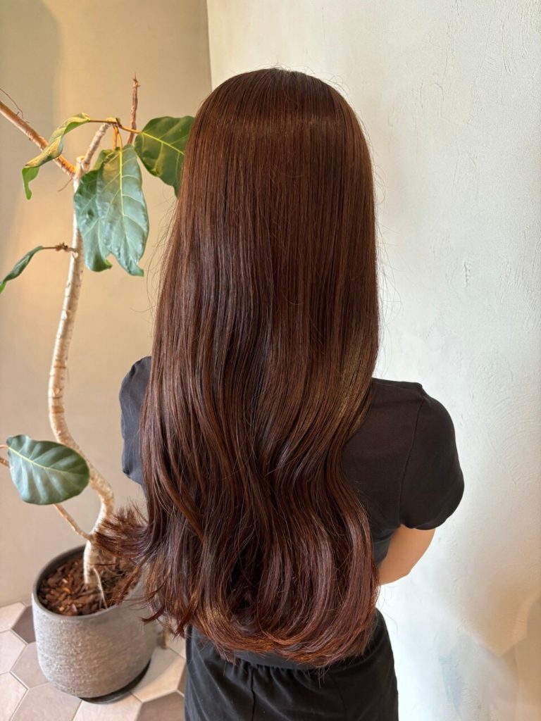 今回は「ナチュラルブラウン」と「髪質改善」の組み合わせです。ロングは女性らしさを引き立ててくれるスタイルですが、どうしても毛先のパサつきやまとまりにくさが気になりやすいですよね。そこで、内部から補修してくれる髪質改善を合わせることで、毛先までしっとりまとまる質感に変わります。